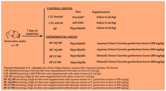 On the first day of the experimental design, the ration was changed simultaneously with the supplementation, which was performed by gavage, in which saline solution (1 mL/kg of animal weight) was administered to the control groups and the aqueous extract to the experimental groups (200 or 400 mg/kg) or ethanolic extract (200 or 400 mg/kg) of G. gardneriana leaves (Figure 1). The experiment lasted 8 consecutive weeks [27,28,29]. The doses were defined based on a study that used Garcinia cambogia, given, to our knowledge, the absence of in vivo studies with the G. gardneriana species [30,31].