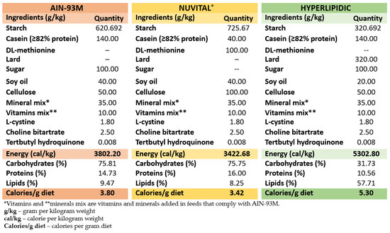 Each group had ad libitum access to water and food during the experimental period; the high-fat diet used in this study was based on that of Lenquiste et al., 2015 [32] and according to experiences of our research group [33] (Figure 2).