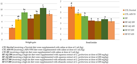 Weight gain (g) and food intake (g) of animals fed a balanced or high-fat diet and supplemented with saline, aqueous extract or ethanol extract of G. gardneriana leaves per day for 8 consecutive weeks. Values expressed as mean ± standard deviation. Different letters indicate a significant difference between groups and groups with the same letter are not significantly different. p < 0.001; n = 6–11; ANOVA followed by Tukey post-test.