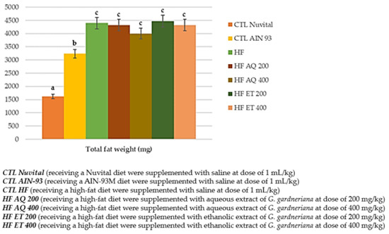 Total fat weight (mg) of animals fed a balanced or high-fat diet and supplemented with saline, aqueous extract or ethanol extract of G. gardneriana leaves per day for 8 consecutive weeks. Values expressed as mean ± standard deviation. Different letters indicate a significant difference between groups and groups with the same letter are not significantly different. p < 0.001; n = 6–11; ANOVA followed by Tukey post-test.