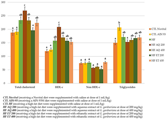 Total cholesterol, fractions and triglycerides (mg/dL) of animals fed a balanced or high-fat diet and supplemented with saline, aqueous extract or ethanol extract of G. gardneriana leaves per day for 8 consecutive weeks. Values expressed as mean ± standard deviation. Different letters indicate a significant difference between groups and groups with the same letter are not significantly different. p < 0.001; n = 6–11; ANOVA followed by Tukey post-test.