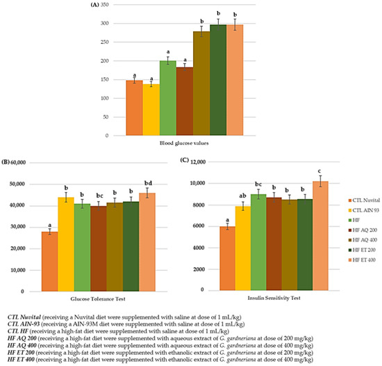 Blood glucose values (mg/dL) (A), and the area under the curve of the insulin sensitivity test (%) (B) and the oral glucose tolerance test (%) (C) of animals fed a balanced or high-fat diet and supplemented with saline, aqueous extract or ethanol extract of G. gardneriana leaves per day for 8 consecutive weeks. Values expressed as mean ± standard deviation. Different letters indicate a significant difference between groups and groups with the same letter are not significantly different. p < 0.05; n = 6–11; ANOVA followed by Tukey post-test.