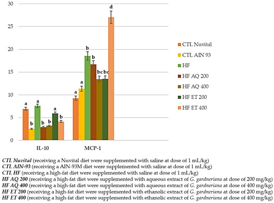 Quantification of IL-10 and MCP-1 (pg/mL) in animals fed a balanced or high-fat diet and supplemented with saline, aqueous extract or ethanol extract of G. gardneriana leaves per day for 8 consecutive weeks. Values expressed as mean ± standard deviation. Different letters indicate a significant difference between groups and groups with the same letter are not significantly different. p < 0.001; n = 6–11; ANOVA followed by Tukey post-test.