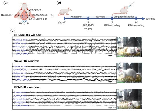 All surgeries were performed in a dedicated stereotaxic frame under inhaled isoflurane anesthesia (2–5% in O2). EEG and EMG electrodes were implanted in rats (n = 6) as described previously [25,26,27,28]. A schematic diagram of the EEG/EMG coordinates is shown in Figure 1a. Briefly, a reference ground screw was placed on the frontal area, and two EEG screws were placed on the bilateral cerebral cortex. Two depth electrodes were placed in the left thalamus (from bregma: AP = −3.0 mm, ML = −3.0 mm, DV = −6.4 mm) and in the right hippocampus (from bregma: AP = −2.8 mm, ML = +1.8 mm, DV = −3.3 mm). The two EMG electrodes were constructed from 15 mm of nylon-insulated silver wire (0.013” coated, A-M Systems, Sequim, WA, USA) and were sutured into the superior nuchal muscles in the back of the neck (Figure 1a). All seven EEG/EMG leads were soldered to the female contacts (E363/0; P1 technologies) and were inserted into a 7-channel pedestal (MS7Pl; P1 technologies). The base of the pedestal and screw heads were secured with dental acrylic (self-curing set; Vertex Dental BV, Zeist, Netherlands), and the skin was sutured, leaving only the pedestal socket exposed. Rats received post-operative analgesia (ketoprofen, 2.5 mg/kg, i.p.) and were housed individually in cages to recover for 1 week before recordings were made.