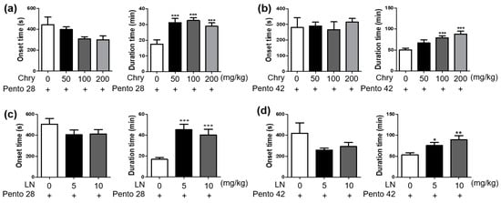Effects of Chry and linarin on sleep onset and sleep duration in pentobarbital-treated mice. The experiment design; mice were fasted for 24 h before the experiment, and Chry ext or linarin was administered at each concentration 1 h and 25 h before the intraperitoneal administration of pentobarbital. Sleep onset and sleep duration were assessed. The results of Chry ext tested at pentobarbital subhypnotic (a) and hypnotic (b) concentrations are displayed. The results of linarin tested at pentobarbital subhypnotic (c) and hypnotic (d) concentrations are displayed. Data are expressed as mean ± SEM. * p < 0.05, ** p < 0.01, and *** p < 0.001, compared with the pentobarbital only group. Chry, Chrysanthemum morifolium extract; Pento, pentobarbital; LN, linarin.