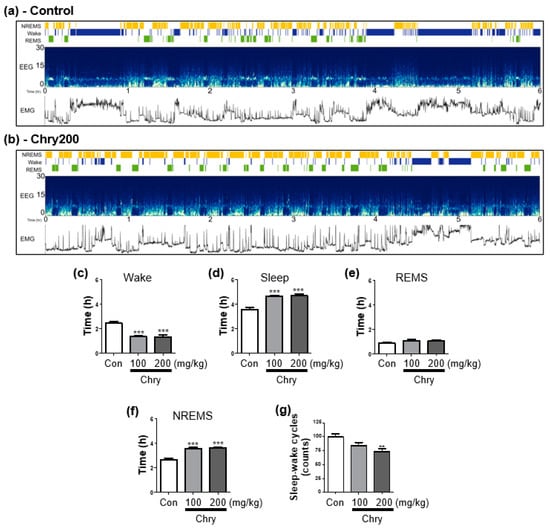 Sleep analysis of rats through automated sleep scoring by AccuSleep algorithm in MATLAB. After the administration of Chry ext (100 and 200 mg/kg, p.o.) once a day for 7 days, EEG and EMG recorded for 6 h (10:00–16:00) at the last administration were used. The representative examples of AccuSleep interface including the sleep stages, EEG spectrogram, and EMG power in control and Chry200 are displayed (a,b). Wake and sleep time analysis (c,d), duration of REMS and NREMS time (e,f), and sleep–wake cycles (g) were determined. Data are expressed as mean ± SEM. ** p < 0.01, and *** p < 0.001, compared with the control group. Chry, Chrysanthemum morifolium extract; EEG, electroencephalogram; EMG, electromyogram; REMS, rapid eye movement sleep; NREMS, non-REMS; Wake, wakefulness.