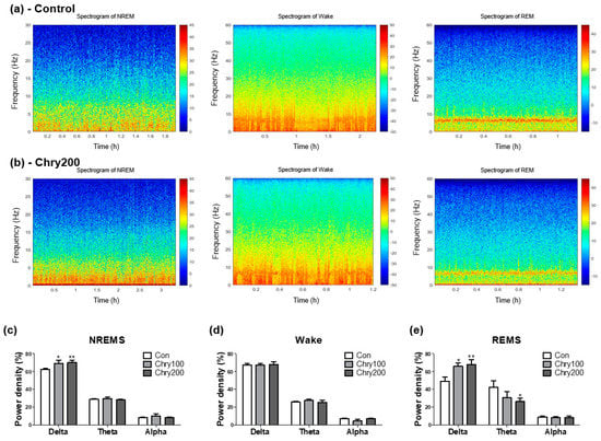 Figure 4a,b show representative time-dependent power spectrum heatmaps for each group in wake, REMS, and NREMS states. Figure 4c–e show the calculated average of the power densities corresponding to the delta (δ; 0.5–4 Hz), theta (θ; 4–8 Hz), and alpha (α; 8–13 Hz) wavelength bands as a percentage of these three wavelengths. The percentage of delta power density was significantly enhanced by treatment with Chry ext (100 and 200 mg/kg) during NREM and REM sleep. The theta frequency band showed a negligible difference between NREMS and wake, whereas in REMS, it showed a slight weakening trend when treated with a high concentration of Chry ext. There was no change in all three wavelengths during wake time.