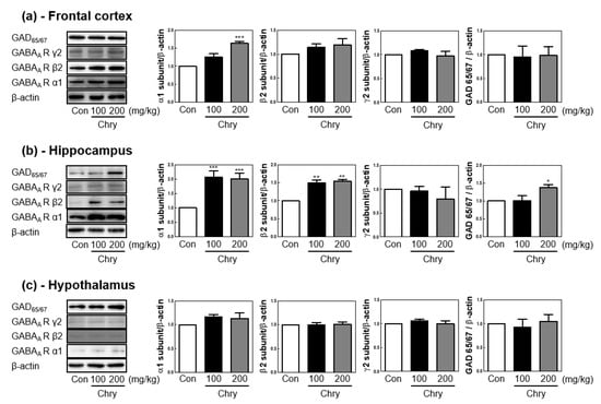Extract of Chry modulates glutamic acid decarboxylate (GAD)65/67 and gamma-aminobutyric acid (GABA)A receptor subunits. Western blot analysis of (a) rat frontal cortex, (b) hippocampus, and (c) hypothalamus after EEG analysis. The representative results from three independent experiments are shown, and quantification data are at the right panel. Data are expressed as mean ± SEM. * p < 0.05, ** p < 0.01, and *** p < 0.001, compared with the control group.