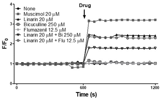 Figure 6 shows the effect of linarin on intracellular Cl− influx using the human SH-SY5Y neuroblastoma cell line in vitro. The concentration used in the experiment was referred from previous reports and determined using cell viability assay and cell cytotoxicity assay. Bicuculline is a competitive GABAA receptor antagonist, and flumazenil is a benzodiazepine receptor antagonist. Muscimol was used as a positive control as a potent GABAA receptor agonist. Pretreatment with antagonists alone did not significantly change MQAE fluorescence values. Treatment with linarin alone caused a decrease in MQAE fluorescence value similar to muscimol treatment, indicating Cl− influx was modulated. Pretreatment with flumazenil before linarin treatment did not significantly affect intracellular Cl− influx compared to linarin alone, but pretreatment with bicuculline inhibited the influx of intracellular Cl− by linarin. These results showed that linarin elevated the Cl− influx via GABAA receptor activation.