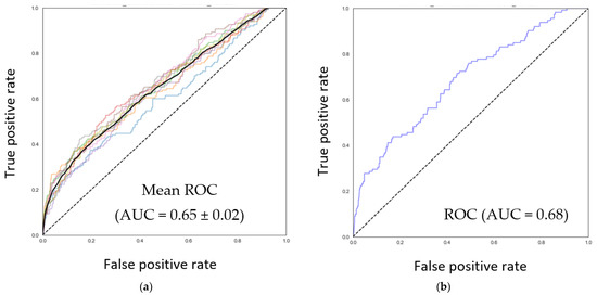 To identify nutrients that can predict the relative abundance of F. prausnitzii in the gut ecosystem as estimated from fecal sampling, random forest and XGBoost machine learning models with three-fold cross-validation were generated using 251 nutrition-related features extracted from FFQs. Among all considered models, model E (Low vs. notLow with cut-off based on mean—1SD, Supplementary Table S2) performed the best with an AUC-ROC of 0.65 ± 0.02 for the training (n = 896) and 0.68 (n = 764) for the test set (Figure 1a,b).