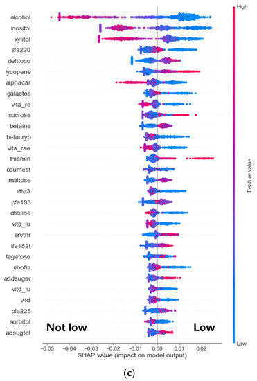 Prediction of relative abundance of F. prausnitzii from nutrient intake data. A random forest model was used to predict the individual’s relative abundance of F. prausnitzii in low or notlow category (<mean—1SD vs. the rest). ROC curves and area under the curve (AUC) values for the training (in cross validation mode with 3 folds, 3 repeats) (a) and test (b) datasets are shown. Different colors in (a) indicate performance under different model runs (3 folds, 3 repeats) and the black line indicates an averaged out Mean performance. Top 30 most important nutrient features of the model are shown in (c), where contributions of each nutrient feature to the model was analyzed by SHAP. Each dot represents an individual sample. Red and blue color gradations depict higher and lower value of the nutrient’s intake, respectively. If a feature has red values towards the right of the vertical line at 0.00, this indicates higher values of this feature contribute towards “Low” model output. Vice versa, if a feature has red values towards the left of the vertical line at 0.00, this indicates higher values of this feature contribute towards “notLow” model output.