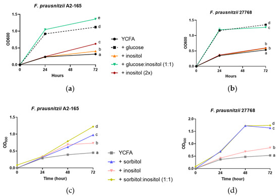 We next investigated whether F. prausnitzii responds differently with increasing amounts of inositol or in combination with other carbon sources. On the inositol-based YCFA media, the growth of A2-165 and 27768 strains only marginally increased compared with YCFA alone (Figure 3a,b, p = 0.0006 for A2-165 and p = 0.0004 for 27768). Doubling the amount of inositol in the media led to 55% more growth with the A2-165 strain (Figure 3a, p < 0.0001) but not with the 27768 strain (Figure 3b, p = 0.7151) when compared with normal amounts of inositol. To further illustrate the strain-specific substrate utilization, a combination of glucose with inositol also increased the growth of strain A2-165 by 21.4% (p < 0.0001) compared to glucose alone, while the combination slightly reduced the growth of 27768 by 6.3% (p < 0.0001). Finally, the addition of inositol to sorbitol promoted the growth of the A2-165 strain by 64.4% and 23.7% compared to sorbitol alone (p < 0.0001), while only a minimal effect of 6.1% was observed on strain 27768 (p < 0.0001; Figure 3c,d).