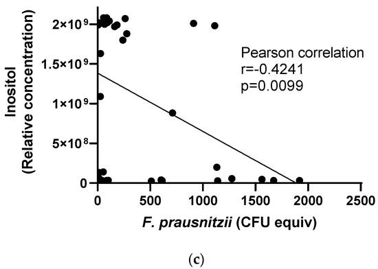 Evaluation of nutrients and nutrient combinations on the growth of F. prausnitzii in a mixed community. Details of in vitro fermentation experiments are described in Methods and Materials. The fold changes in F. prausnitzii at 24 h (a) and 48 h (b) from the baseline were calculated from results of F. prausnitzii-specific qPCR quantification. Each treatment was tested in 4 fecal samples and data are shown in mean ± SEM. Statistical analysis was performed with ANOVA followed by Tukey post hoc analysis, but no statistically significant difference was found. Relationship between inositol and the amount of F. prausnitzii is shown in (c). Signals of butyrate were extracted from 1H-NMR metabolomics as expressed as relative concentration and the amount of F. prausnitzii was determined with qPCR technique shown as CFU equivalent (equiv). Data were pooled from the groups with added inositol at 6, 24, and 48 h time points. Each (•) corresponds to a sample taken from the in vitro fermentation experiment. Pearson correlation analysis indicates a positive relationship between the number of F. prausnitzii and butyrate (p = 0.0099, r = 0.4241).