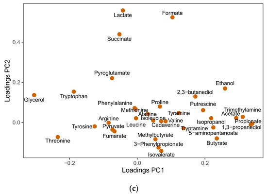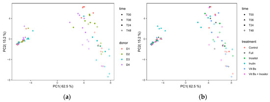 PCA analysis of metabolomic profiles of in vitro fermentation media. Effects of nutrient or nutrient combinations were examined in four microbiota backgrounds (D1, D2, D3 and D4 corresponds to donor 1, 2, 3 and 4). Samples were collected at times 0, 6, 24, and 48h (T00, T06, T24 and T48) from batch fermentation experiments. Each dot in the PCA score plot represents an individual, and the shape and color of symbol denote the time point, fecal donor, or nutrition treatment (a,b), respectively. The loading plot highlighted the metabolites influencing distribution in PCA score plots (c).