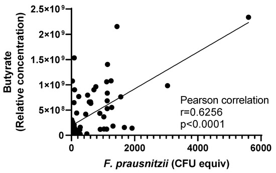 Focusing more precisely on the metabolization of the tested substrates, we observed in all four donors, that inositol was fully consumed over time (Supplementary Figure S7A–C) independently of vitamin supplementation, and the rate of consumption was not related to the level of F. prausnitzii. Finally, as F. prausnitzii is one of the key butyrate-producing bacteria [42], we examined the correlation between F. prausnitzii and butyrate in the batch fermenters. Butyrate levels were undetectable at times 0 and 6 h and were indistinguishable among groups at 24 h (Supplementary Figure S8A). At 48 h, butyrate was higher in the inulin group than in the Full and VitBs+inositol groups (Supplementary Figure S8B). Taking all samples into account, we observed a positive correlation between levels of F. prausnitzii and butyrate concentration (Pearson correlation, r = 0.6252, p < 0.0001; Figure 6). Even after removing the leverage point, the result is still significant (p < 0.0001, r = 0.4661). This correlation remained significant when considering D3 alone while only a trend was observed for D1 and D4 (Supplementary Figure S9).