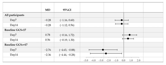 | Total GCS | 14.1 ± 4.8 | 14.0 ± 4.3 | 14.3 ± 5.5 | −0.25 (−1.13, 0.64) | 0.59 |