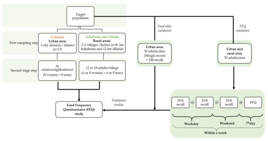 In each study area, we carried out representative two-step random sampling by considering city districts or villages as clusters (Figure 2). In the first sampling step, we selected two or three clusters per arrondissement using random numbers generated by the Excel software. In the second step, we randomly chose a direction by spinning a pen at the centre of each cluster for household selection. One adult, aged between 19 and 65 years, was interviewed in each selected household. An equal number of men and women were selected by cluster. The sample size was chosen based on previous studies that used FFQs in Africa [17]: 641 adults in Cotonou were surveyed and 576 in Adjohoun and Allada (288 respondents per rural area).