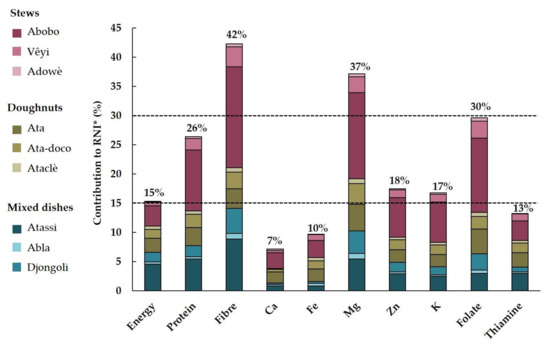 Independently of the area (rural vs. urban), the Abobo stew, widely consumed and in large quantities by the adult population according to the 7-day recall data, was the dish that most contributed to the RNI of the studied nutrients (Table S7).