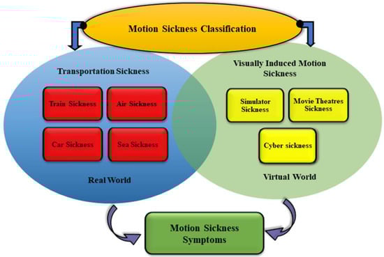 Classification of MS in both real and virtual environments. Airsickness, seasickness, carsickness, and trainsickness can occur on airplanes, ships, cars, and trains, respectively, while cybersickness, simulator sickness, and movie theater sickness can be caused using head-mounted displays, simulators, video games, and large 3D screens, respectively. Despite MS has been categorized into different subsections; however, the main symptoms are the same.