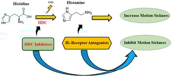 The central histamine system is involved in several central nervous system functions, such as sympathetic nervous system activation, an increase in stress-related hormones, and MS [,]. Therefore, activation of the vestibular system triggers the histaminergic neuronal system during MS occurrence, which eventually stimulates histamine H1 receptors in the brainstem and induces vomiting []. First-generation antihistamine medications exert their effects by either blocking histaminergic responses mediated by the H1 receptors in the nervous system or by inhibiting the activity of histidine decarboxylase (HDC) enzyme, which is the primary enzyme responsible for catalyzing histamine synthesis [] (see Figure 3).
