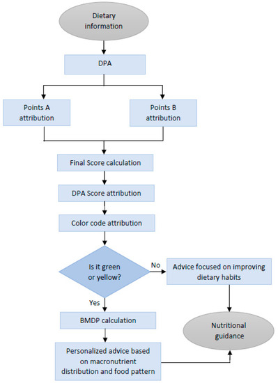 In summary, the DPA uses dietary information as the input to start the assessment, quantifies and qualifies the diet, and then reaches a final verdict whether the diet can be considered healthy or not. This is used to generate the nutritional guidance for each specific user. In case of an affirmative answer, the DPA proceeds to calculate the BMDP and analyze the food groups to assess whether an optimal diet is being followed or whether there is room for improvement. In any case, personalized advice adjusted to the consumer wishes and preferences can be delivered. If the answer is negative, then the DPA proceeds to give advice focused on improving the dietary habits. Thus, feeding the DPA with dietary data (see below) allows the running of the algorithm and its use as a tool for nutritional guidance and education. whether is in nutritional consultation or in a nutrition-related app (Figure 2).
