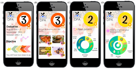 A sample of a mobile interface screens showing the DPA implementation as colored plates. (A) DPA score and the progress of the user; (B) tailored recipe suggestions; (C) the actual food groups; (D) some recommended improvements in order to provide personalized advice.