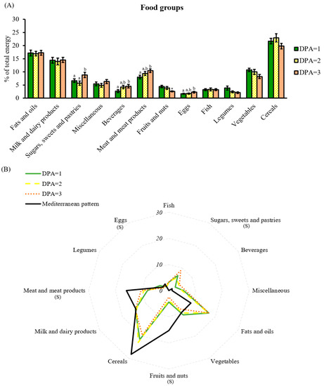 Food group analysis by DPA score. (A) Percentage of total energy coming from food groups classified by DPA score; (B) comparison of the reference food groups based on the Mediterranean diet with the food groups shown in the cohort and classified by DPA score. Data are mean ± SEM DPA scores 1, 2, and 3 (n = 23, 18, and 18, respectively). Statistics: (A) groups with different letters are significantly different (LSD post hoc one-way ANOVA, p-value ≤ 0.05); if not significant, single comparisons between DPA = 1 and DPA = 2 or 3 were assessed by Student’s t-test (*, p-value ≤ 0.05); (B) S, differences between DPA scores and Mediterranean diet (one-way ANOVA, p-value ≤ 0.05). Abbreviations: DPA: diet profiling algorithm.