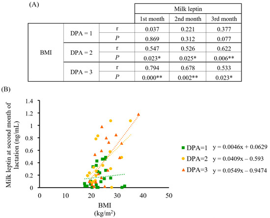 Correlation analysis between BMI and breast milk leptin concentration in the cohort classified by DPA score (n = 23, 18, and 18, respectively). (A) Spearman’s correlation data between BMI and leptin at the first, second, and third month of lactation by DPA score; (B) scatter plot and linear regression trend lines with data from the second month of lactation. Statistics: Spearman’s correlation test, * p-value ≤ 0.05 (** = p-value < 0.01). Abbreviations: BMI: body mass index; DPA: diet profiling algorithm; r: Spearman’s rank correlation coefficient; p: p-value.