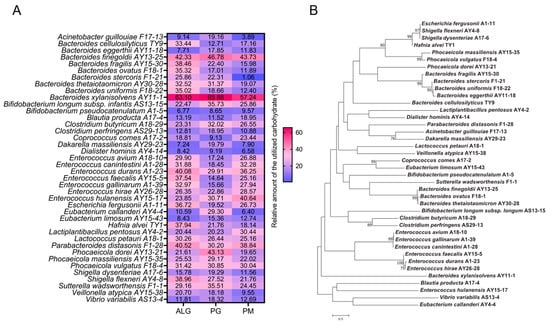 Isolation of alginate-degrading bacteria from the human gut microbiota. Phylogenetic tree analysis of the alginate-degrading bacteria (A). Heatmap analysis of the alginate-degrading capabilities of the isolated bacteria (B). The number indicates the relative amount of alginate that was utilized by the bacteria after 48 h of fermentation. Only one representative strain in each genus was used for the above analyses. Alginate (ALG), polyguluronate (PG), polymannuronate (PM).