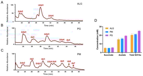 Since B. xylanisolvens AY11-1 was identified as the most efficient degrader of alginate, we further investigated its degradation products and fermentation products using mass spectrometry and high-performance liquid chromatography. Interestingly, the degradation of alginate by B. xylanisolvens AY11-1 produced significant amounts of unsaturated oligosaccharides with a degree of polymerization ranging from two to four (Figure 2A). However, degradation of PG by B. xylanisolvens AY11-1 produced significant amounts of both saturated and unsaturated oligosaccharides with a degree of polymerization ranging from two to four (Figure 2B). Degradation of PM by B. xylanisolvens AY11-1 produced significant amounts of both saturated and unsaturated oligosaccharides with a degree of polymerization ranging from two to seven (Figure 2C). The fermentation of alginate and its derivatives by B. xylanisolvens AY11-1 produced significant amounts of SCFAs, including acetate and succinate (Figure 2D). Altogether, our results indicate that B. xylanisolvens AY11-1 is a proficient degrader and fermenter of alginate and its derivatives in the human gut.