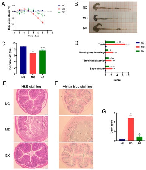 In the animal experiment 1, a total of 24 male 8-week-old C57BL/6J SPF mice were utilized to investigate the anti-colitis effect of B. xylanisolvens AY11-1. The 24 male mice were divided into 3 different groups: the normal control group (NC, n = 8), the model group (MD, n = 8) and the B. xylanisolvens AY11-1 treatment group (BX, n = 8). B. xylanisolvens AY11-1 was cultured in the VI medium for approximately 24 h before harvesting for the animal experiments. B. xylanisolvens AY11-1 was dissolved in an anaerobic phosphate-buffered saline (PBS). B. xylanisolvens AY11-1 was given at a dosage of approximately 1.05 × 107 colony forming units (CFUs)/day/mouse with gavage. Mice in the MD group and the BX group were given 2.0% (w/v) DSS in their daily drinking water for 6 consecutive days. All mice were humanely sacrificed on the 7th day. The colon and cecum tissues of the mice were harvested for further experiments. The stool morphology, bleeding occurrence and body weight of the mice were monitored every day. The symptom scores of the mice were calculated based on the stool morphology, bleeding occurrence and body weight change in the mice at the 7th day. The histopathological colon scores of the mice were calculated based on the hematoxylin and eosin (H&E) staining results. The Alcian blue staining and the H&E staining of the mouse colon tissues were performed using the method previously described [,].