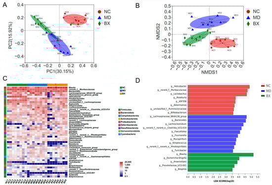 B. xylanisolvens AY11-1 altered the structure and modulated the composition of the gut microbiota. PCA score plot (A) and NMDS score plot analyses of the structure of the gut microbiota (B). Heatmap analysis of the gut microbiota at the genus level (C). LEfSe LDA score analysis of the gut microbiota (D). Only bacterial taxa with an LDA score of 3.5 are listed.