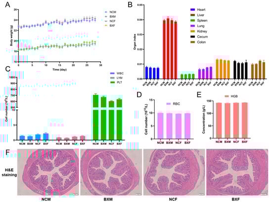 In the animal experiment 2, a total of 20 male and 20 female 8-week-old C57BL/6J SPF mice were employed to investigate the safety of B. xylanisolvens AY11-1. The 40 mice were divided into 4 different groups: the male normal control group (NCM, n = 10), the male B. xylanisolvens AY11-1 treatment group (BXM, n = 10), the female normal control group (NCF, n = 10) and the female B. xylanisolvens AY11-1 treatment group (BXF, n = 10). As detailed above, B. xylanisolvens AY11-1 was cultured in the VI medium for approximately 24 h before harvesting for the animal experiments. B. xylanisolvens AY11-1 was dissolved in an anaerobic PBS. B. xylanisolvens AY11-1 was given at a dosage of approximately 1.00 × 108 CFUs/day/mouse with gavage. All mice were humanely sacrificed on the 28th day. The blood, heart, lung, liver, spleen, kidney, colon and cecum tissues of the mice were collected for further experiments. The blood cells of the mice were analyzed using the automatic blood cell analyzer (RT-7600Vet) from Rayto Life and Analytical Sciences Co., Ltd. (Shenzhen, China). The H&E staining was performed using the liver, spleen, kidney and colon tissues from the male and female mice as previously described [,].