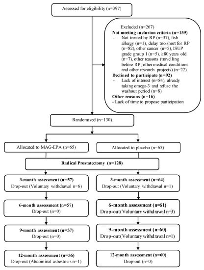 Study’s flow chart. MAG-EPA: monoacylglyceride-conjugated eicosapentaenoic acid; RP: radical prostatectomy; ISUP: International Society of Urological Pathology.