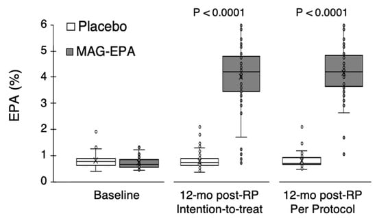 The EPA level in red blood cell membranes of the MAG-EPA group was significantly increased at 12 months (4%), while it was stable in the placebo group (0.8%) (Figure 2).