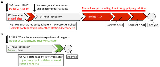 HiTCA enables high-throughput, scalable, and reliable bioassay of CAMP. A workflow comparison between (A) the ex vivo CAMP assay, which employs 1 million (1 M) PBMC, and (B) the High Throughput CAMP Assay (HiTCA), which employs 100,000 (0.1 M) HiTCA cells. Difficulties of the ex vivo assay are written in red text. The means by which HiTCA addresses these issues are written in green text.