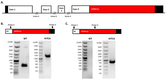 Together, Cas9-sgRNA complexes and donor plasmids were electroporated into SC cells using Synthego’s optimized protocol. Editing efficiency was assessed upon recovery 48 h following electroporation. Genomic DNA was extracted from a portion of the cells, PCR amplified and sequenced using Sanger sequencing. The sequencing results were processed using Synthego Inference of CRISPR Edits software (ICE, ice.synthego.com). Edited cell pools identified by ICE were seeded at <1 cell/well using a single-cell printer into 96- or 384-well plates to create monoclonal cell populations. All wells were imaged every 3 days to ensure expansion from a single-cell clone. Ultimately, a monoclonal population of homozygous CAMPmCherry human SC cells (referred to hereafter as HiTCA cells) was identified and confirmed by PCR genotyping (Figure 2). The primers used for PCR genotype analysis were as follows: primer 1, 5′-AAGGTGAGTGGGCTGTTCTG-3′; primer 2, 5′-ATTGGGTGTAGGGATTCAATCACA-3′; primer 3, 5′-AAGCGCATGAACTCCTTGAT-3′, primer 4, 5′-GAGTAGAGCTCCTTAATTCCCCAC-3′.