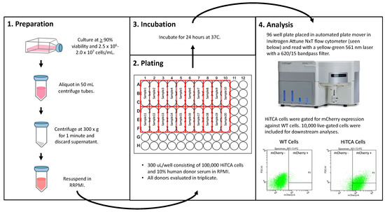 For high-throughput analyses, HiTCA cells were added to 50 mL conical tubes and centrifuged at 300× g for 10 min. The media was removed, and the pellet was resuspended in an equal volume of RPMI. Cells were then plated in a 96-well plate at a concentration of 100,000 cells/well. Depending on the specifics of the experimental conditions, human serum along with treatment substrates (e.g., ethanol and vitamin D metabolites) were added to each well such that the total volume/well was 300 uL. Each sample was assayed in triplicate. The cells were then incubated for 24 h at 37 °C. While present in the culture media used for cell maintenance, FBS, sodium pyruvate, and Penstrep antibiotic were all absent from culture media used for incubation and analysis. After the 24 h incubation period, high-throughput flow cytometry analysis was performed on an Invitrogen Attune NxT (Thermo Fisher Scientific). The samples were read with a yellow–green 561 nm laser with a 620/15 bandpass filter. All cells were gated to exclude non-viable cells and doublets. WT cells acted as negative controls for CAMPmCherry gating, with gating parameters set such that WT cells were 1% CAMPmCherry positive. Ultimately, 10,000 live cells in single-cell suspension were included for data collection using Invitrogen Attune NxT built-in software (Thermo Fisher Scientific) and analysis using FlowJo. GraphPad Prism 8 was used for statistical analyses and figure production. This protocol is summarized in Figure 3.