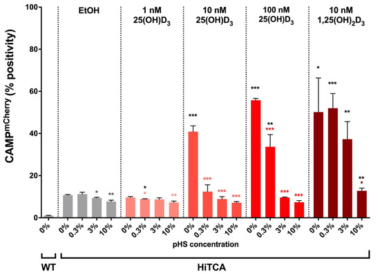 Pooled human serum dose-dependent attenuation of HiTCA CAMPmCherry response. HiTCA cells were incubated in RPMI, EtOH (equal volume as vitamin D metabolite solvent), vitamin D metabolites (1 nM 25(OH)D3, 10 nM 25(OH)D3, 100 nM 25(OH)D3, 10 nM 1,25(OH)2D3), and pooled human serum (pHS; 0%, 0.3%, 3%, 10%) at 37 °C for 24 h prior to flow cytometry analysis. EtOH-treated WT cells were gated to be 1% CAMPmCherry positive. Therefore, all non-WT columns represent the percentage of 10,000 live-gated single-cells that express CAMPmCherry above the WT control levels. Each column represents n = 3 biological replicates ± SD. Black asterisks represent significant differences (* p < 0.05, ** p < 0.01, *** p < 0.001) between vitamin D metabolite-treated HiTCA cells and their EtOH equivalent with the same pHS exposure. Colored asterisks represent significant differences (* p < 0.05, ** p < 0.01, *** p < 0.001) between 0% pHS-treated HiTCA cells and non-zero pHS-treated HiTCA cells of the same vitamin D metabolite treatment group.