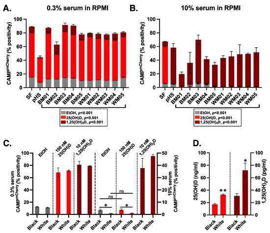 HiTCA response to varying human donor serum concentrations. HiTCA cells were treated with either EtOH (equal volume as vitamin D metabolite solvent), 100 nM 25(OH)D3, or 10 nM 1,25(OH)2D3 and one of the following serum treatments: serum-free (SF: no exogenous serum added), pooled human serum (pHS), or individual donor serum. Individual donor serum concentration and culture media conditions were varied as follows: (A) 0.3% serum in RPMI and (B) 10% serum in RPMI. Data represent the percentage of 10,000 live-gated single-cells that express CAMPmCherry with gate of EtOH-treated WT cells set to 1% positive. Each column represents n = 3 biological replicates ± SEM. Columns representing the three vitamin D metabolite treatments are superimposed according to serum treatment. Vitamin D metabolite treatments are color-coded according to the figure legend. Statistical significance p < 0.001 was attained between individual donors in all treatment conditions by ANOVA. (C) Data from panels A and B are displayed as comparisons of average percentage CAMPmCherry signals from the Black (n = 5) and White (n = 5) samples in the various indicated test conditions (y-axis, 0.3% serum on left and 10% serum on right) and above the column graphs (EtOH, 100 nM 25(OH)D3, or 10 nM 1,25(OH)2D3). Differences between Black and White samples were observed in only two conditions, * p < 0.05. Differences between EtOH and 100 nM 25(OH)D3, and EtOH and 10 nM 1,25(OH)2D3 within corresponding Black/White groups were all significant (p < 0.01) with the exception of two indicated non-significant (ns) comparisons. (D) Measured serum 25(OH)D (left axis) and 1,25(OH)2D (right axis) mean concentrations of the Black and White samples used in study. * p < 0.05 and ** p < 0.001 was observed comparing Black with White samples.