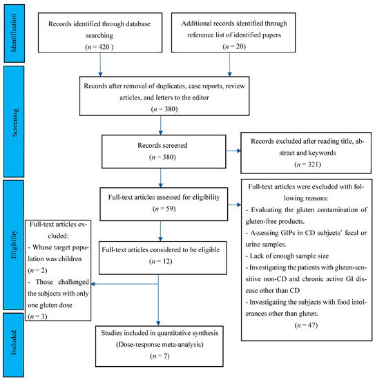 Following the databases’ search, 440 potentially eligible records were recognized in the initial screening published from 1990 to 2022. After the removal of duplicates, case reports, review articles, and letters to the editor, 380 records were considered for further screening of the titles and abstracts. Following screening titles, abstracts, and keywords, 59 records were included for full-text reviewing, eligible criteria evaluation, and quality assessment. After full-text, independent reviewing by 2 investigators, 47 papers were excluded for fitting any of the following categories: studies with the aim of evaluating the gluten contamination of gluten-free products; studies that measured gluten immunogenic peptides (GIPs) in fecal or urine samples of CD patients; studies without enough sample size; cases that evaluated the response of gluten-sensitive non-CD patients to gluten digestion; and studies including subjects with chronic active gastrointestinal disease other than CD or subjects with food intolerances other than to gluten. Two studies that enrolled pediatric cohorts and three papers with only one gluten dose challenge were excluded. The flow chart of the study selection process is outlined in Figure 1. Finally, seven studies met the eligibility criteria.