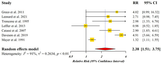 Forest plot of pooled relative risks (RR) with 95% CI for included studies [4,21,33,34,35,36,37]. Yellow Squares: Point estimate of risk ratio, Red Diamond: Total estimate of risk ratio.