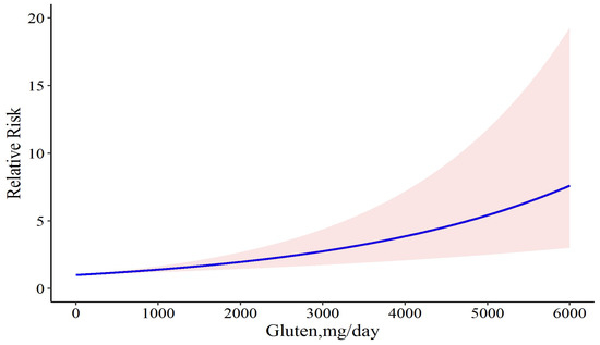 The dose-response meta-analysis of gluten dose and risk of CD relapse. The solid curve and the shadow area indicate the relative risk with a corresponding 95% confidence interval.