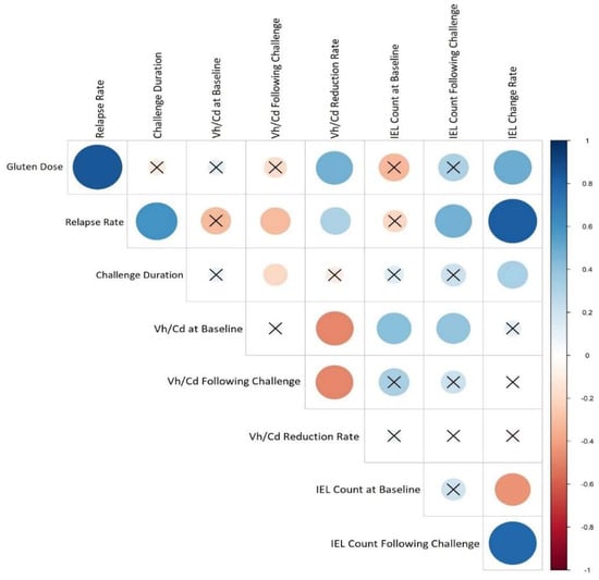 Heat map corresponding to the correlation between CD relapse and studies’ features. Each lattice color represents the intensity of the correlation, with blue representing a positive correlation coefficient and red representing a negative one. Crossed circles represent a non-significant correlation. Large circles indicate a stronger correlation between the row and the column variables.