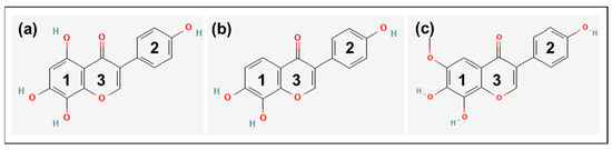 Chemical structure of (a) 8-hydroxygenistein (8OHGen; 4′,5,7,8-Tetrahydroxyisoflavone; C15H10O6, PubChem CID: 5492944), (b) 8-hydroxydaidzein (8OHDai; 7,8,4′-Trihydroxyisoflavone; C15H10O5, PubChem CID: 5466139) and (c) 8-hydroxyglycitein (8OHGly; 7,8,4′-Trihydroxy-6-methoxyisoflavone; C16H12O6, PubChem CID: 10870296). Structures were taken from PubChem [17]. 1: Benzene ring 1; 2: Benzene ring 2; 3: Heterocyclic pyrone ring.