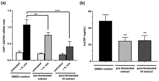 Incubation of Hep 3B cells with 10 µg/mL pre-fermented soy extract significantly inhibited the mRNA expression of the inflammatory marker CRP after IL1ß plus IL6 stimulation by ca. 30% (Figure 5). An even more potent inhibition of ca. 60% was observed by incubating the cells with post-fermented HI-rich extract (10 µg/mL). However, when analyzing the impact on the level of secreted protein, both pre- and post-fermented extracts significantly reduced the CRP concentration similarly by about 50%.