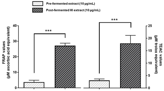 We next tested the free radical scavenging properties of pre- or post-fermented soy extracts (10 µg/mL) by employing the ferric-reducing ability of plasma (FRAP) assay as well as the Trolox equivalent antioxidant capacity (TEAC) assay, respectively. As shown in Figure 6, in both cases the fermented soy extract with the increased HI content exhibited a significantly higher antioxidative capacity than the pre-fermented soy extract.