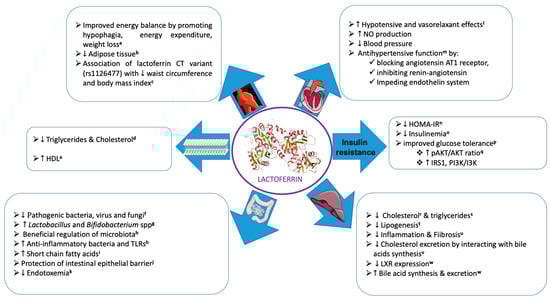 Although some information supporting a beneficial influence on the components of MetS is available, there has been no exhaustive work on CMD in humans as far as we know. An inverse relationship was apparent between circulating levels of LF, and fasting triglyceride and glucose concentrations, waist-to-hip ratio, and in direct correlation with plasma HDL-cholesterol []. Similarly, obese women displayed an inverse association between LF and adiposity despite independent positive association with insulin resistance (IR), for which the precise mechanisms for these observations have not been elucidated []. Furthermore, LF levels were positively and negatively associated with insulin sensitivity and inflammatory parameters, respectively [], an important observation since systemic low-grade inflammation commonly characterized individuals with obesity [,]. In line with these encouraging LF effects, human LF exhibited the ability to chelate LPS, and to interfere with the binding between LPS and soluble human CD14, thereby alleviating inflammation []. Interestingly, the hypolipidemic effect of LF was reported to be dependent on its binding to the LDL receptor-related protein 1 (LRP1). The investigators hypothesized that LF molecule alterations disturb the interaction with LRP1 receptors, which produces repercussions on lipid concentrations and their elimination from blood circulation. In this context, it should be noted that the Arg-rich sequence of LF N-terminus bears resemblance to apolipoprotein E structure sighted by LRP1 [].