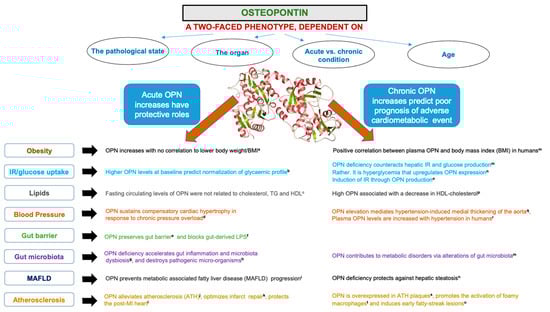 The same discords apply to the role of OPN in CMD. If OPN was associated in the development of adipose tissue inflammation and IR [,], obesity, and hepatic steatosis [,], there was an unaltered fatty acid oxidation and synthesis between wild-type and OPN knockout livers in obesity (along with the downregulation of Forkhead box O1 and PPAR gamma co-activator 1α), which usually enhance mitochondrion genesis, lipid degradation, and insulin sensitivity []. Other reports underline that OPN deficiency in old mice led to hepatic steatosis and hypertriglyceridemia in relationship with IR []. Similarly, liver fibrosis was noted in OPN-knockout mice under high-fat feeding in association with inflammation, DNA damage, and IR []. The hepatic protective role of OPN was emphasized in alcoholic hepatitis [,] and in transgenic mice, which markedly lowered hepatic steatosis, balloon cell degeneration, lipid peroxidation, inflammation, and plasma alanine aminotransferase [].