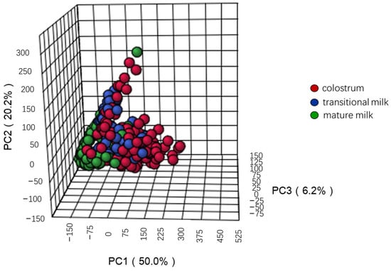 Principal component analysis (PCA) of HMOs showed a spectral separation among different lactation stages, indicating significant differences of concentrations of oligosaccharides (Figure 1). The first principal component (PC1) with PC2 and PC3 described 76.4% of the variation contained in the concentrations of HMO from different lactation stages. The dispersion of within-particular groups can be observed on the PCA score plot and indicated a small variance in HMO concentrations among mature milk samples. There were significant differences in the concentrations of 23 oligosaccharides among three lactation stages based on ANOVA (p < 0.05). The box diagrams of oligosaccharides during three lactation stages are shown in Figure 2; lower case letters represent significant differences. Median total HMO concentration was 13.6 g/L, 10.7 g/L, and 6.0 g/L for colostrum, transitional milk, and mature milk, respectively, and decreased significantly the longer the interval since birth (p < 0.0001). The concentrations in colostrum were the highest and the concentrations in mature milk were the lowest, and showed a gradual downward trend in concentration for the following 14 oligosaccharides: 2′-FL, lacto-N-neotetraose (LNnT), sialyllacto-N-tetraose c (LSTc), LNFP-I, disialylated LNT (DSLNT), difucosyl-para-lacto-N-neohexaose (DFpLNnH), difucosyl-lacto-N-hexaose (DFLNH[a]), 3-sialyllactose (3′-SL). Through pairwise comparison, there were significant differences in HMO concentrations between any two groups (colostrum, transitional milk, mature milk) for these oligosaccharides (p < 0.05). The concentration of 3-fucosyllactose (3-FL) showed a gradual upward trend during lactation stages, and the concentrations in mature milk were higher than in colostrum and transitional milk (p < 0.05). The concentration of lacto-difucotetraose (LDFT) first decreased and then increased, and the concentration in colostrum was higher than in transitional milk, or mature milk (p < 0.05). The concentrations of other oligosaccharides also first increased then decreased, including sialyllacto-N-tetraose b (LSTb), 6-Sialyllactose (6′-SL), LNFP-II, monofucosyl-lacto-N-neohexaose (MFLNnH), and monofucosyl-lacto-N-hexaose III (MFLNH-III). The concentrations of oligosaccharides at different lactation stages are shown in Table S1.